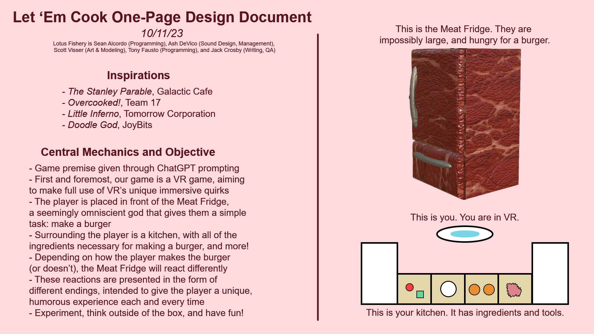 Let 'Em Cook is a VR cooking/horror game that has its players work to satisfy an impossibly large fridge comprised entirely of meat. They work to create a burger by cutting ingredients and cooking them on the grill to appease the Meat Fridge, and the different burgers they can make result in various different endings.