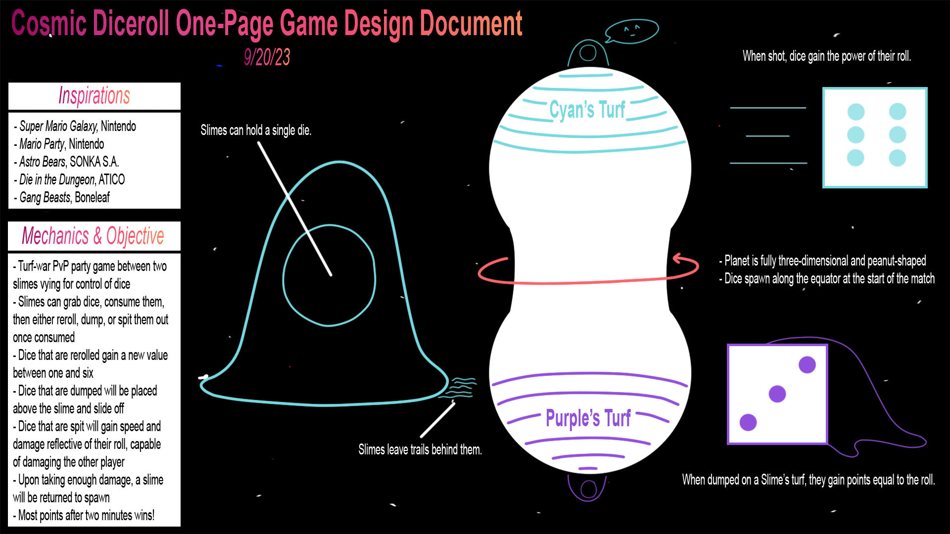 Cosmic Diceroll is a party game with up to 4 players where you play as slimes in space who are fighting over territory over their planet. Take the dice that spawn around the map and use them to fight off the enemy slimes!