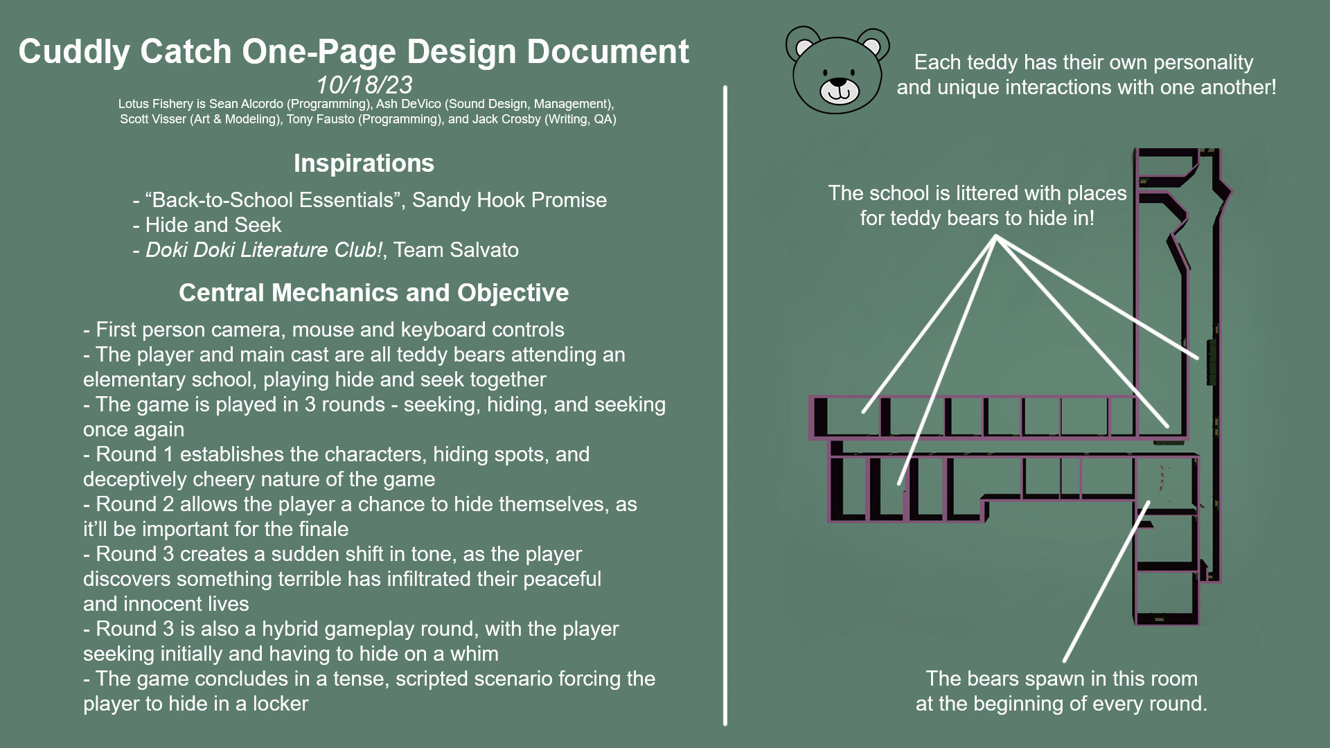 Cuddly Catch is a narrative based game where you play as an innocent Teddy Bear playing Hide and Seek with their friends until something goes terribly wrong...